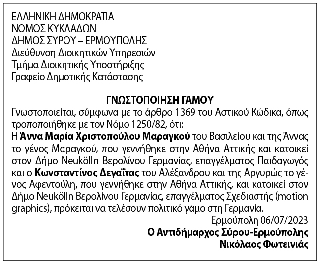 Γνωστοποίηση γάμου για Άννα Μαρία Χριστοπούλου Μαραγκού και Κωνσταντίνο Δεγαΐτα Κείμενο Βλέπε εικόνα. Αριθμός Φύλλου: 6162 Κατηγορία: Γνωστοποίηση Γάμου