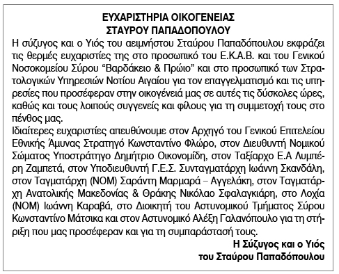 Ευχαριστήριο από την οικογένεια Σταύρου Παπαδόπουλου Κείμενο Βλέπε εικόνα. Αριθμός Φύλλου: Αριθμός Φύλλου 6164 Κατηγορία: Κατηγορία Ευχαριστήριο
