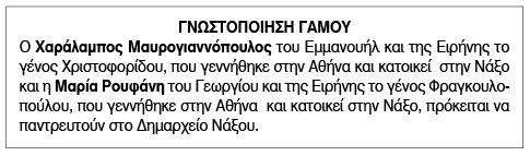 Γνωστοποίηση γάμου για Χαράλαμπο Μαυρογιαννόπουλο και Μαρία Ρουφάνη Κείμενο Βλέπε εικόνα. Αριθμός Φύλλου: 6171 Κατηγορία: Γνωστοποίηση Γάμου
