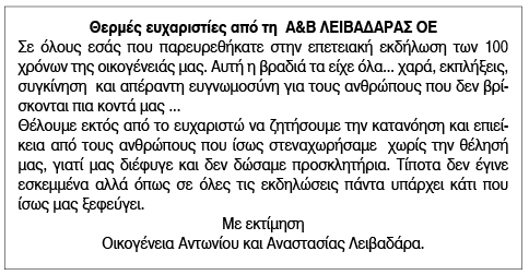 Ευχαριστήριο για την εκδήλωση των εκατό χρόνων από την οικογένεια Λειβαδάρα Κείμενο Βλέπε εικόνα. Αριθμός Φύλλου: 6187 Κατηγορία: Ευχαριστήριο