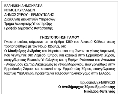 Γνωστοποίηση γάμου για Μουζούρη Ανδρέα και Ειρήνη Ρούσσου Κείμενο Βλέπε εικόνα. Αριθμός Φύλλου: 6191 Κατηγορία: Γνωστοποίηση Γάμου