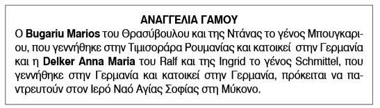 Αναγγελία γάμου για Bugariu Marios και Delker Anna Maria Κείμενο Βλέπε εικόνα. Αριθμός Φύλλου: 6193 Κατηγορία: Αναγγελία Γάμου