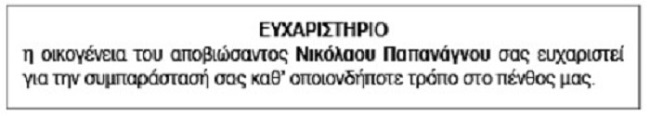 Ευχαριστήριο για Νικόλαο Παπανάγνου Κείμενο Βλέπε εικόνα. Αριθμός Φύλλου: Αριθμός Φύλλου 6210 Κατηγορία: Κατηγορία Ευχαριστήριο