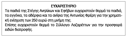 Ευχαριστήριο για δωρεές από τη Στέγη Ανηλίκων και Εφήβων Σύρου Κείμενο Βλέπε εικόνα. Αριθμός Φύλλου: 6218 Κατηγορία: Δωρεές