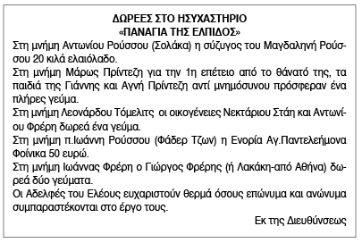 Ευχαριστήριο για δωρεές από το Ησυχαστήριο "Παναγία της Ελπίδος" Κείμενο Βλέπε εικόνα. Αριθμός Φύλλου: 6220 Κατηγορία: Δωρεές