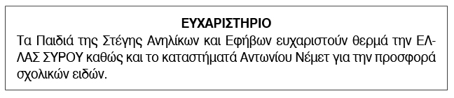 Ευχαριστήριο για δωρεές από τη Στέγη Ανηλίκων και Εφήβων Σύρου Κείμενο Βλέπε εικόνα. Αριθμός Φύλλου: Αριθμός Φύλλου 6223 Κατηγορία: Κατηγορία Δωρεές