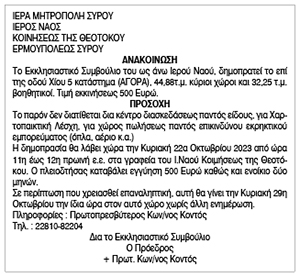 Δημοπρασία καταστήματος επί της οδού Χίου, από τον Ιερό Ναό Κοιμήσεως της Θεοτόκου Ερμουπόλεως Σύρου