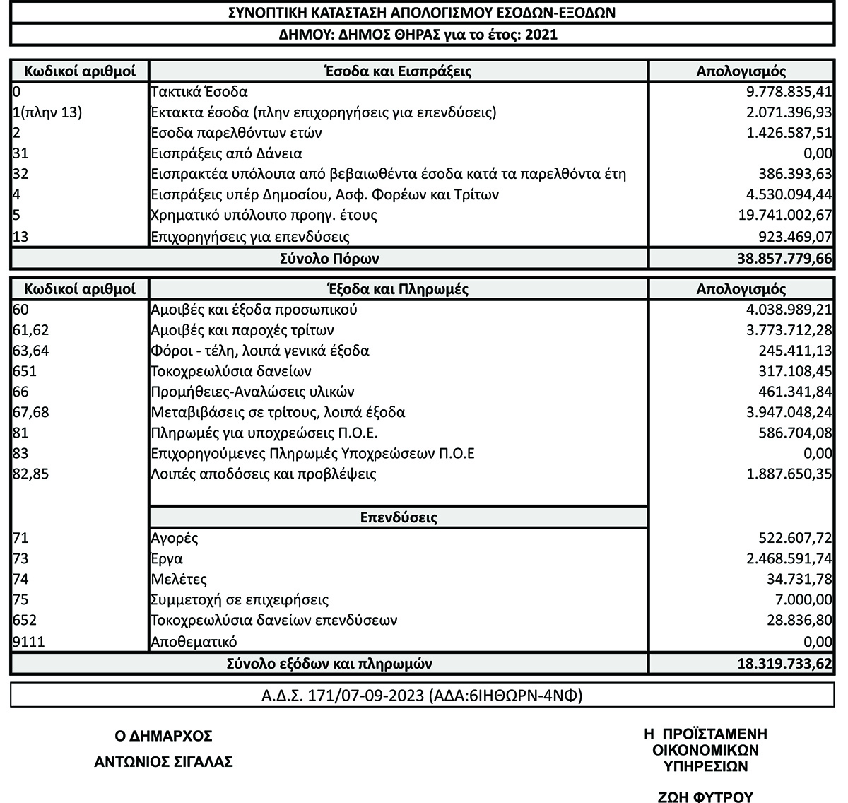 Συνοπτική κατάσταση απολογισμού εσόδων - εξόδων Δήμου Θήρας για το έτος 2021 Κείμενο Βλέπε εικόνα. Αριθμός Φύλλου: Αριθμός Φύλλου 6232 Κατηγορία: Κατηγορία Απολογισμός