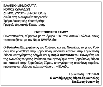 Γνωστοποίηση γάμου για Βλαχογιάννη Θεόφιλο και Παπουτσά Μαρία Κείμενο Βλέπε εικόνα. Αριθμός Φύλλου: 6239 Κατηγορία: Γνωστοποίηση Γάμου