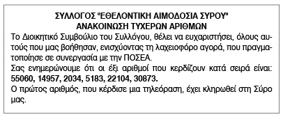 Ανακοίνωση από την Εθελοντική Αιμοδοσία Σύρου Κείμενο Βλέπε εικόνα. Αριθμός Φύλλου: Αριθμός Φύλλου 6241 Κατηγορία: Κατηγορία Δωρεές