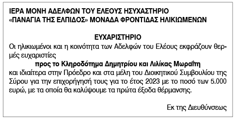 Ευχαριστήριο για δωρεές από την Ιερά Μονή Αδελφών του Ελέους, ησυχαστήριο "Παναγία της Ελπίδος" Κείμενο Βλέπε εικόνα. Αριθμός Φύλλου: 6246 Κατηγορία: Δωρεές