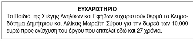 Ευχαριστήριο για δωρεά, από τη Στέγη Ανηλίκων και Εφήβων Σύρου Κείμενο Βλέπε εικόνα. Αριθμός Φύλλου: Αριθμός Φύλλου 6247 Κατηγορία: Κατηγορία Δωρεές