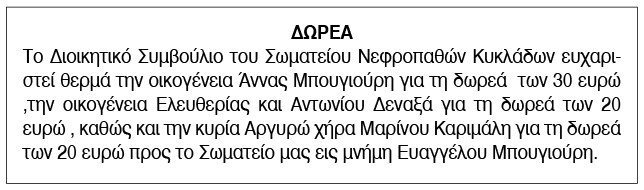 Ευχαριστήριο για δωρεές από το Σωματείο Νεφροπαθών Κυκλάδων Κείμενο Βλέπε εικόνα. Αριθμός Φύλλου: 6255 Κατηγορία: Δωρεές