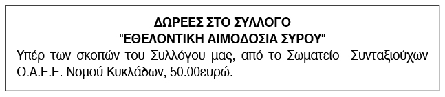 Ευχαριστήριο για δωρεές από την Εθελοντική Αιμοδοσία Σύρου Κείμενο Βλέπε εικόνα. Αριθμός Φύλλου: Αριθμός Φύλλου 6261 Κατηγορία: Κατηγορία Δωρεές