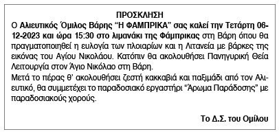 Πρόσκληση Αλιευτικού Ομίλου Βάρης "Η Φάμπρικα" για τη γιορτή του Αγίου Νικολάου Κείμενο Βλέπε εικόνα. Αριθμός Φύλλου: Αριθμός Φύλλου 6262 Κατηγορία: Κατηγορία Πρόσκληση