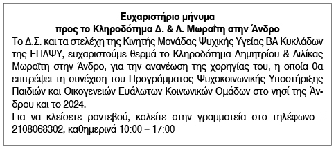 Ευχαριστήριο από την Κινητή Μονάδα Ψυχικής Υγείας ΒΑ Κυκλάδων της ΕΠΑΨΥ για χορηγία από το Κληροδότημα Δ. & Λ. Μωραΐτη στην Άνδρο Κείμενο Βλέπε εικόνα. Αριθμός Φύλλου: 6264 Κατηγορία: Δωρεές