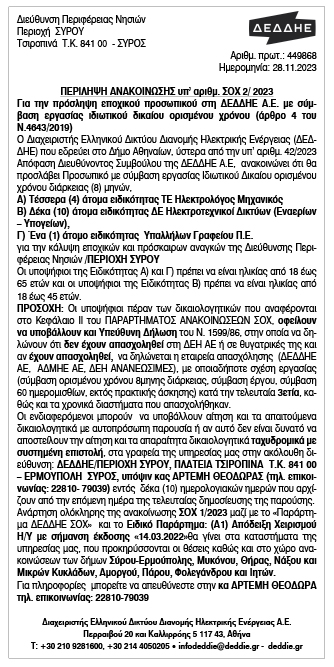 Περίληψη ανακοίνωσης υπ' αριθμ. ΣΟΧ2/2023, από τη ΔΕΔΔΗΕ Σύρου Κείμενο Βλέπε εικόνα. Αριθμός Φύλλου: 6266 Κατηγορία: Προκήρυξη Θέσεων