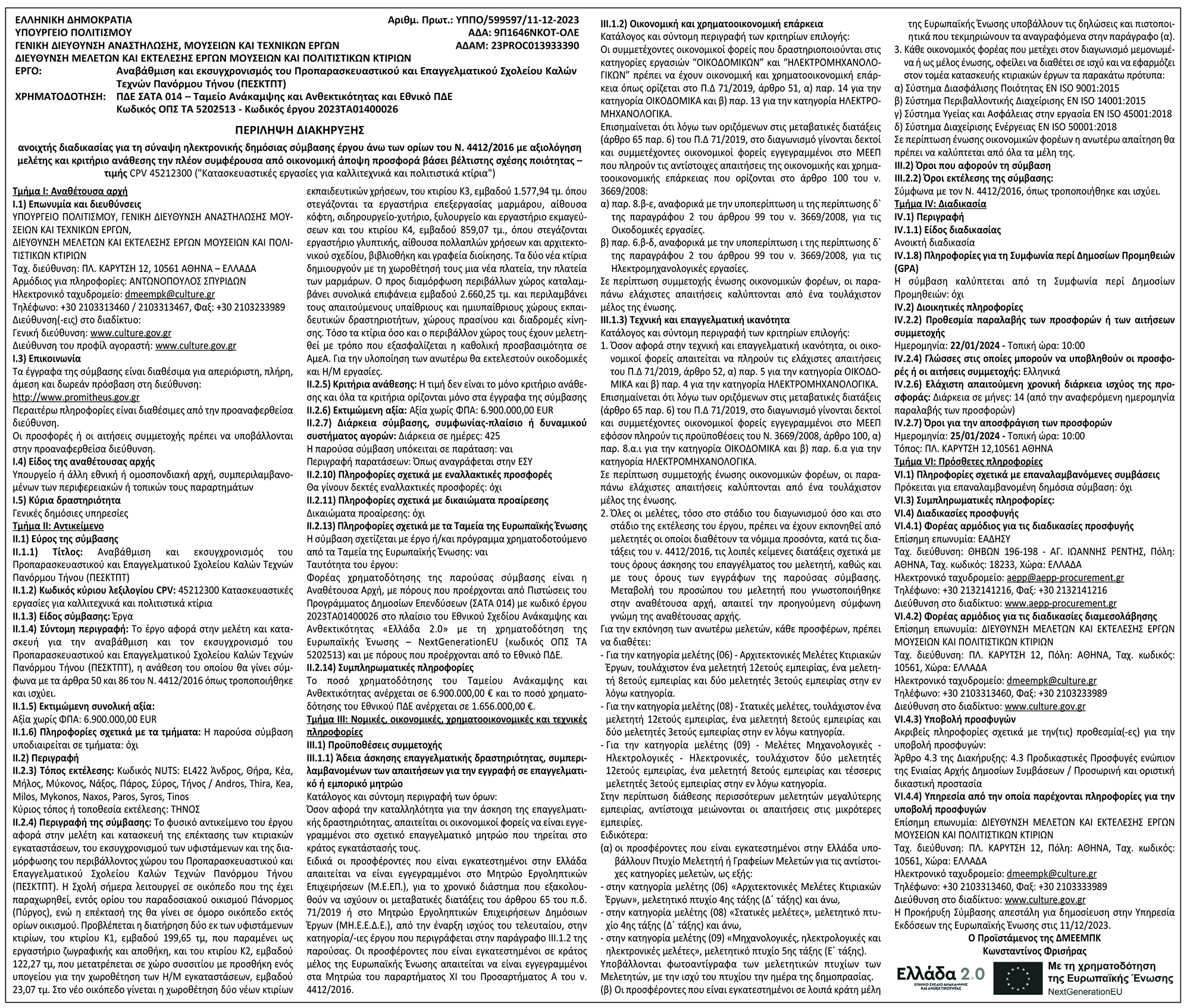 Αναβάθμιση & εκσυγχρονισμός προπαρασκευαστικού & επαγγελματικού Σχολείου Καλών Τεχνών Πανόρμου Τήνου Κείμενο Βλέπε εικόνα. Αριθμός Φύλλου: 6268 Κατηγορία: Προκήρυξη Έργων - Δημοπρασίες