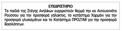 Ευχαριστήριο για δωρεές από τη Στέγη Ανηλίκων και Εφήβων Σύρου Κείμενο Βλέπε εικόνα. Αριθμός Φύλλου: Αριθμός Φύλλου 6285 Κατηγορία: Κατηγορία Δωρεές