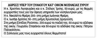 Ευχαριστήριο για δωρεές από την Κατ' οίκον Νοσηλεία Σύρου Κείμενο Βλέπε εικόνα. Αριθμός Φύλλου: 6285 Κατηγορία: Δωρεές
