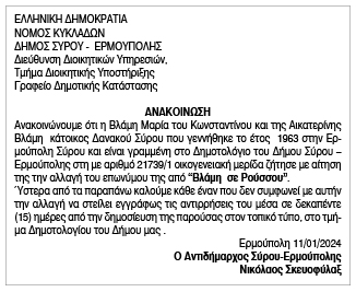 Ανακοίνωση για αλλαγή επωνύμου από Βλάμη σε Ρούσσου Κείμενο Βλέπε εικόνα. Αριθμός Φύλλου: 6285 Κατηγορία: Ανακοίνωση