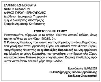 Γνωστοποίηση Γάμου για Ρούσσο Νικόλαο και Μπουζάκη Παρασκευή Κείμενο Βλέπε εικόνα. Αριθμός Φύλλου: 6291 Κατηγορία: Γνωστοποίηση Γάμου