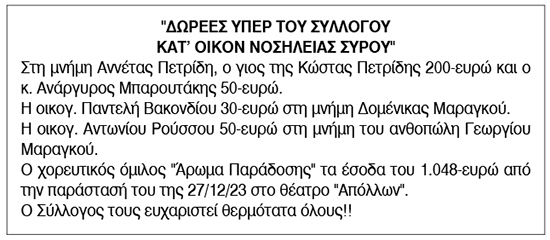 Ευχαριστήριο για δωρεές από το Σύλλογο Κατ' Οίκον Νοσηλεία Σύρου Κείμενο Βλέπε εικόνα. Αριθμός Φύλλου: 6292 Κατηγορία: Δωρεές