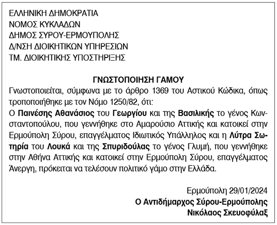 Γνωστοποίηση γάμου για Παινέση Αθανάσιο και Λύτρα Σωτηρία Κείμενο Βλέπε εικόνα. Αριθμός Φύλλου: 6298 Κατηγορία: Γνωστοποίηση Γάμου