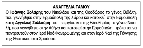 Αναγγελία γάμου για Ιωάννη Σολάρη και Αγγελική Συλλούρη Κείμενο Βλέπε εικόνα. Αριθμός Φύλλου: 6299 Κατηγορία: Αναγγελία Γάμου