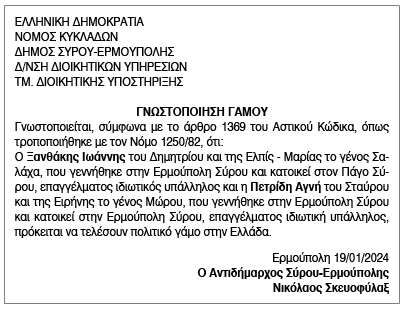 Γνωστοποίηση γάμου για Ξανθάκη Ιωάννη και Πετρίδη Αγνή Κείμενο Βλέπε εικόνα. Αριθμός Φύλλου: 6302 Κατηγορία: Γνωστοποίηση Γάμου