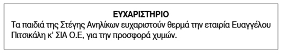 Ευχαριστήριο για δωρεά από τη Στέγη Ανηλίκων και Εφήβων Σύρου Κείμενο Βλέπε εικόνα. Αριθμός Φύλλου: Αριθμός Φύλλου 6303 Κατηγορία: Κατηγορία Δωρεές