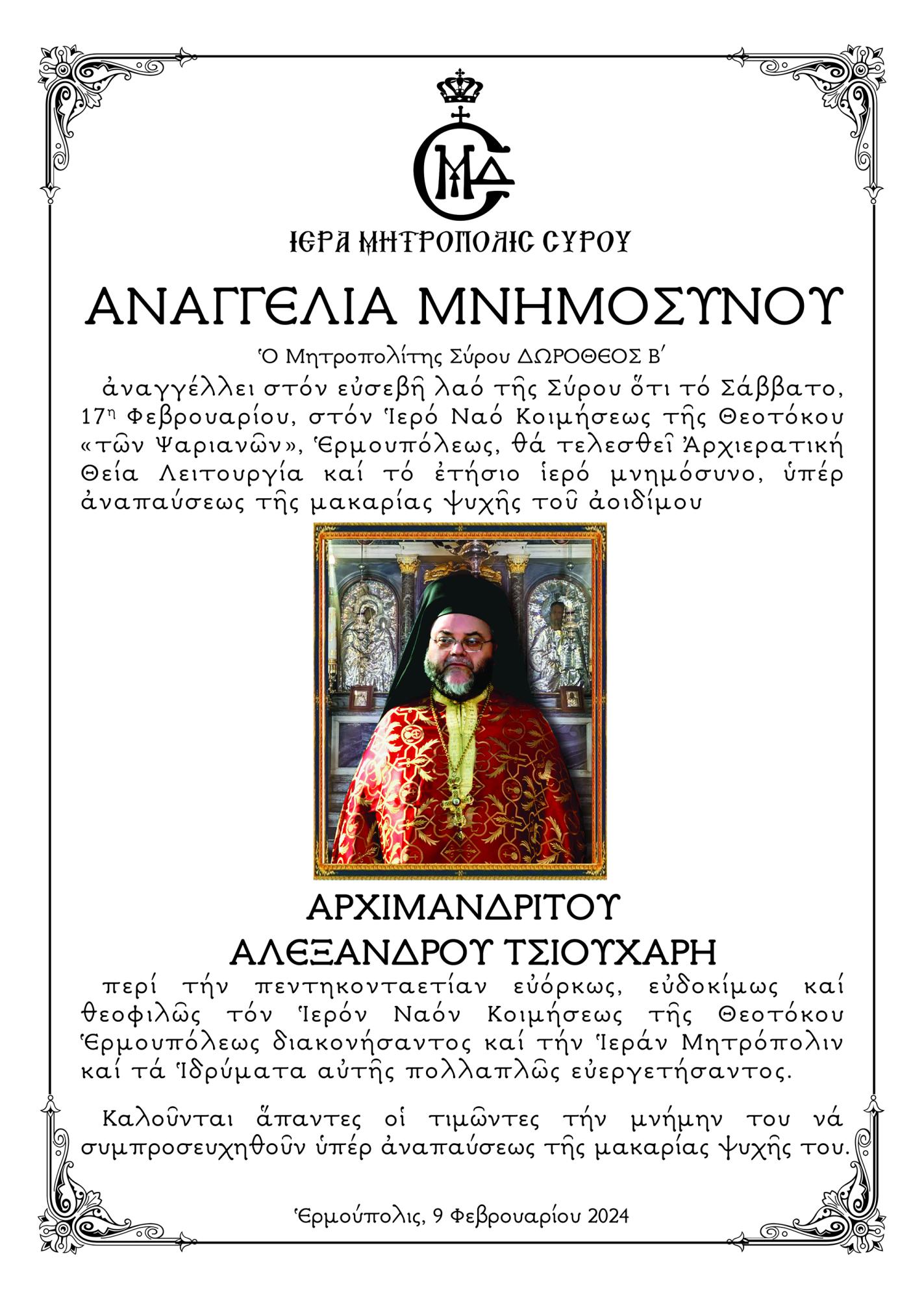 Αγγελτήριο ετήσιου μνημόσυνου για τον Αρχιμανδρίτη Αλέξανδρο Τσιουχάρη Κείμενο Βλέπε εικόνα. Αριθμός Φύλλου: Αριθμός Φύλλου 6310 Κατηγορία: Κατηγορία Μνημόσυνο
