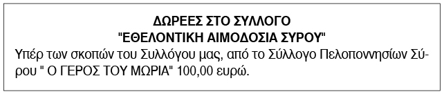 Δωρεές Εθελοντικής Αιμοδοσίας Σύρου Κείμενο Βλέπε εικόνα Αριθμός Φύλλου: Αριθμός Φύλλου 6314 Κατηγορία: Κατηγορία Δωρεές