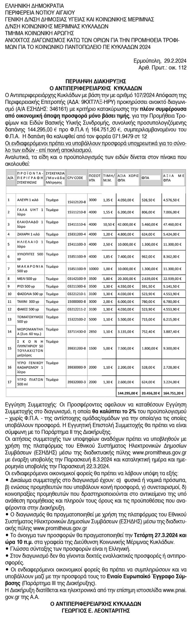 Προμήθεια ειδών και τροφίμων Κοινωνικού Παντοπωλείου ΠΕ Κυκλάδων Κείμενο Βλέπε εικόνα. Αριθμός Φύλλου: Αριθμός Φύλλου 6321 Κατηγορία: Κατηγορία Προκήρυξη Έργων - Δημοπρασίες