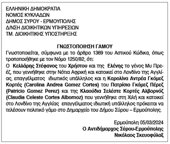 Γνωστοποίηση γάμου για Κελλάρη Στέφανο και Καρολίνα Αντρέα Γκόμεζ Κορτές Κείμενο Βλέπε εικόνα. Αριθμός Φύλλου: Αριθμός Φύλλου 6323 Κατηγορία: Κατηγορία Γνωστοποίηση Γάμου