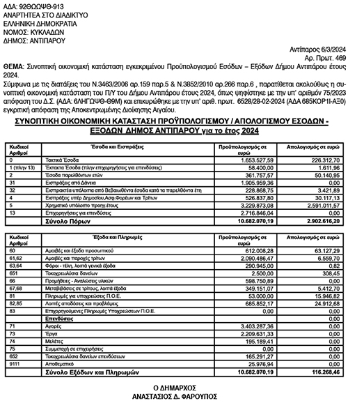 Συνοπτική οικονομική κατάσταση προϋπολογισμού/απολογισμού εσόδων - εξόδων, από το Δήμο Αντιπάρου για το έτος 2024 Κείμενο Βλέπε εικόνα. Αριθμός Φύλλου: Αριθμός Φύλλου 6325 Κατηγορία: Κατηγορία Προϋπολογισμοί