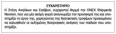 Ευχαριστήριο για δωρεές από τη Στέγη Ανηλίκων και Εφήβων Σύρου Κείμενο Βλέπε εικόνα. Αριθμός Φύλλου: Αριθμός Φύλλου 6327 Κατηγορία: Κατηγορία Δωρεές