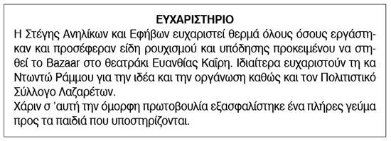 Ευχαριστήριο για δωρεές από τη Στέγη Ανηλίκων και Εφήβων Σύρου Κείμενο Βλέπε εικόνα. Αριθμός Φύλλου: Αριθμός Φύλλου 6332 Κατηγορία: Κατηγορία Δωρεές