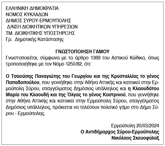 Γνωστοποίηση γάμου για Τσαούση Παναγιώτη και Κλαουδάτου Μαρία Κείμενο Βλέπε εικόνα. Αριθμός Φύλλου: Αριθμός Φύλλου 6333 Κατηγορία: Κατηγορία Γνωστοποίηση Γάμου