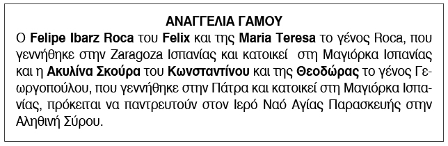 Αναγγελία γάμου για Felipe Ibarz Roca και Ακυλίνα Σκούρα Κείμενο Βλέπε εικόνα. Αριθμός Φύλλου: Αριθμός Φύλλου 6338 Κατηγορία: Κατηγορία Αναγγελία Γάμου