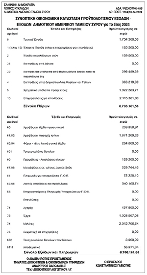 Συνοπτική οικονομική κατάσταση Προϋπολογισμού εσόδων - εξόδων Δημοτικού Λιμενικού Ταμείου Σύρου για το έτος 2024 Κείμενο Βλέπε εικόνα. Αριθμός Φύλλου: 6346 Κατηγορία: Προϋπολογισμοί