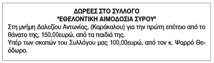 Ευχαριστήριο για δωρεές από την Εθελοντική Αιμοδοσία Σύρου Κείμενο Βλέπε εικόνα. Αριθμός Φύλλου: Αριθμός Φύλλου 6354 Κατηγορία: Κατηγορία Δωρεές