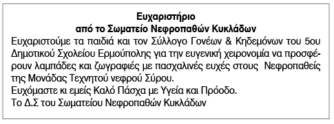 Ευχαριστήριο για δωρεές από το Σωματείο Νεφροπαθών Κυκλάδων Κείμενο Βλέπε εικόνα. Αριθμός Φύλλου: Αριθμός Φύλλου 6360 Κατηγορία: Κατηγορία Δωρεές