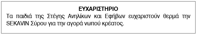 Ευχαριστήριο για δωρεές από τη Στέγη Ανηλίκων και Εφήβων Σύρου Κείμενο Βλέπε εικόνα. Αριθμός Φύλλου: Αριθμός Φύλλου 6361 Κατηγορία: Κατηγορία Δωρεές