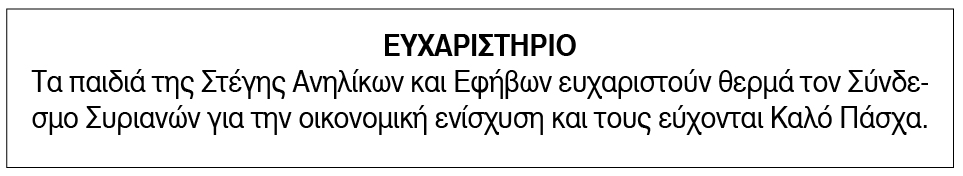 Ευχαριστήριο για δωρεές από τη Στέγη Ανηλίκων και Εφήβων Σύρου Κείμενο Βλέπε εικόνα. Αριθμός Φύλλου: Αριθμός Φύλλου 6363 Κατηγορία: Κατηγορία Δωρεές
