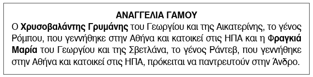 Αναγγελία γάμου για Χρυσοβαλάντη Γρυμάνη και Φραγκιά Μαρία Κείμενο Βλέπε εικόνα. Αριθμός Φύλλου: 6366 Κατηγορία: Αναγγελία Γάμου