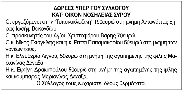 Ευχαριστήριο για δωρεές από το Σύλλογο Κατ' οίκον Νοσηλεία Σύρου Κείμενο Βλέπε εικόνα. Αριθμός Φύλλου: 6372 Κατηγορία: Δωρεές
