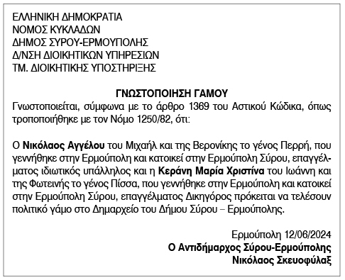 Γνωστοποίηση Γάμου για Νικόλαο Αγγέλου και Κεράνη Μαρία - Χριστίνα. Κείμενο Βλέπε εικόνα. Αριθμός Φύλλου: 6390 Κατηγορία: Γνωστοποίηση Γάμου