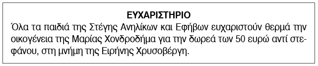 Ευχαριστήριο για δωρεές από τη Στέγη Ανηλίκων και Εφήβων Σύρου Κείμενο Βλέπε εικόνα. Αριθμός Φύλλου: Αριθμός Φύλλου 6408 Κατηγορία: Κατηγορία Δωρεές