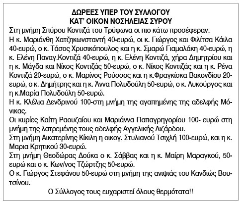Ευχαριστήριο για δωρεές από το Σύλλογο Κατ' οικον Νοσηλείας Σύρου Κείμενο Βλέπε εικόνα. Αριθμός Φύλλου: 6416 Κατηγορία: Δωρεές